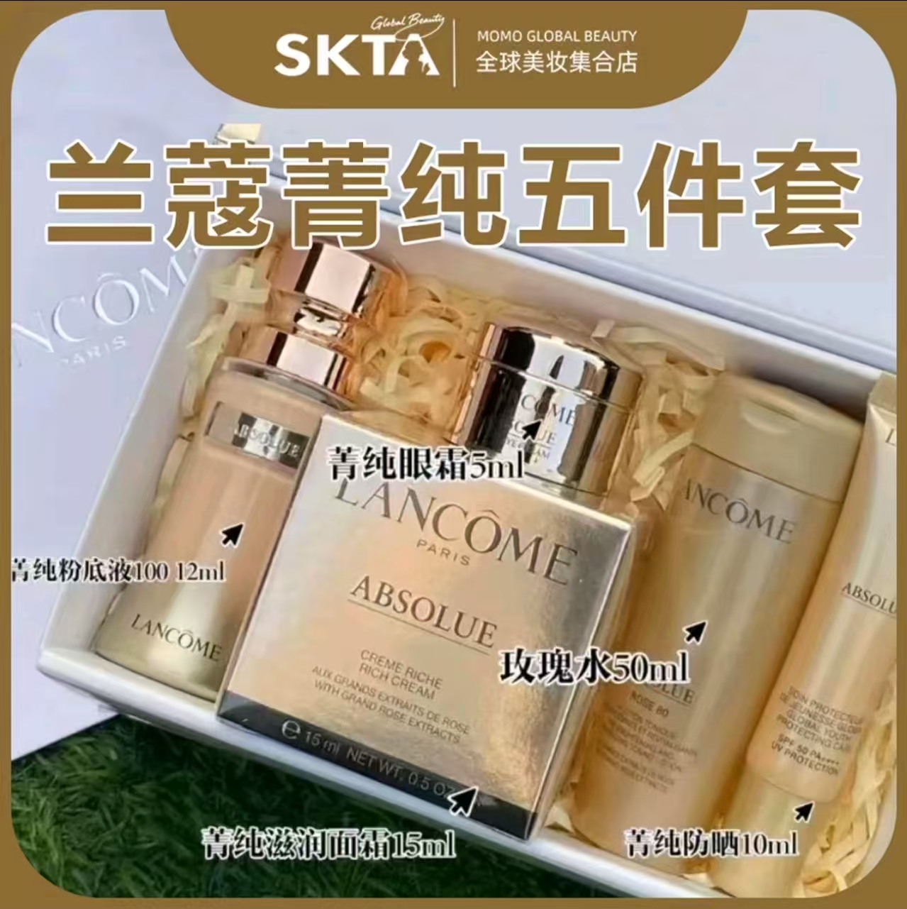 兰蔻箐纯五件套内含:玫瑰水50ml+防晒10ml+面霜15ml+100粉底液+12ml眼