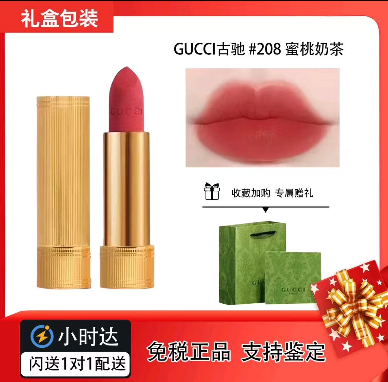 古驰/208蜜桃奶茶GUCCI倾色口红哑光素颜显白3.5g/支生日礼物新年情人节礼物A26